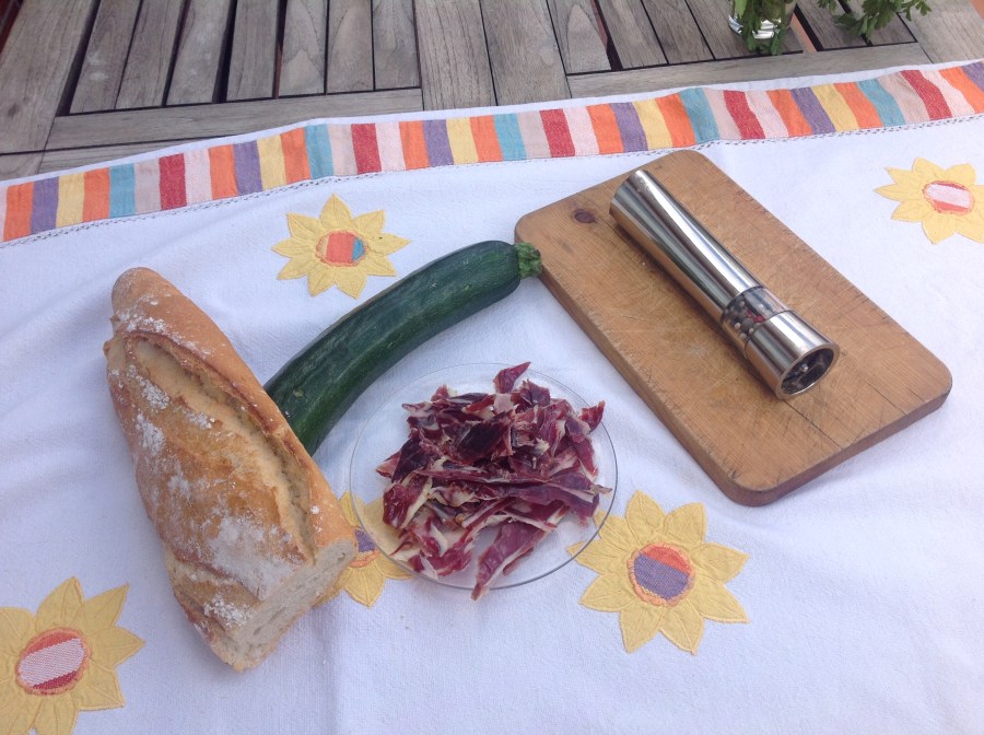 Pincho de calabacín con crujiente de jamón.