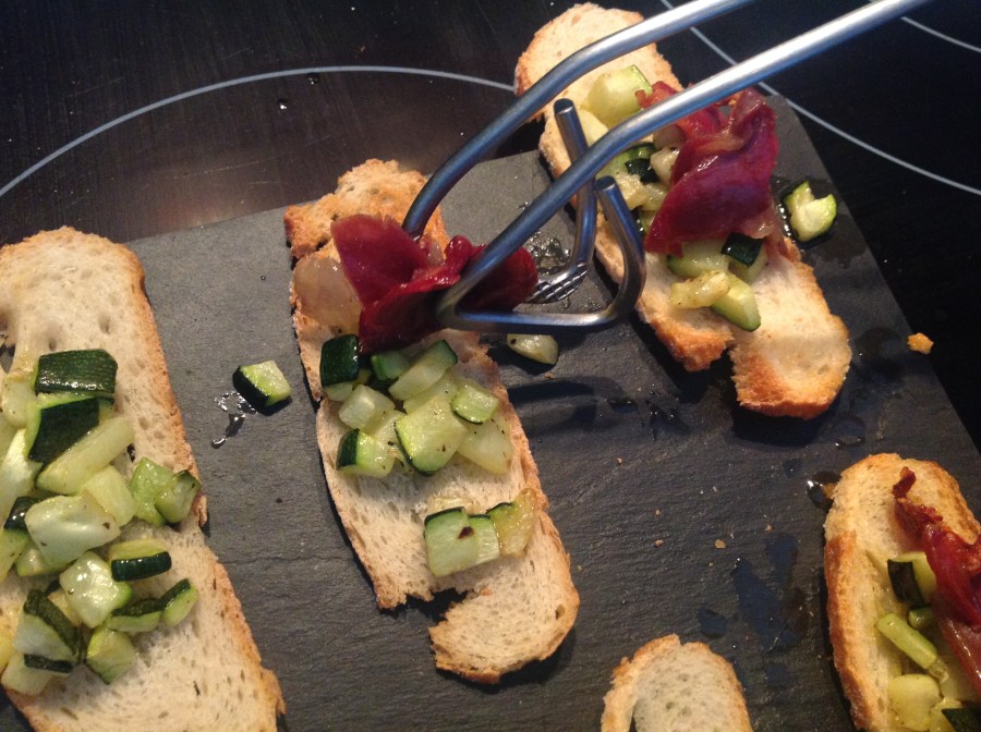 Pincho de calabacín con crujiente de jamón.