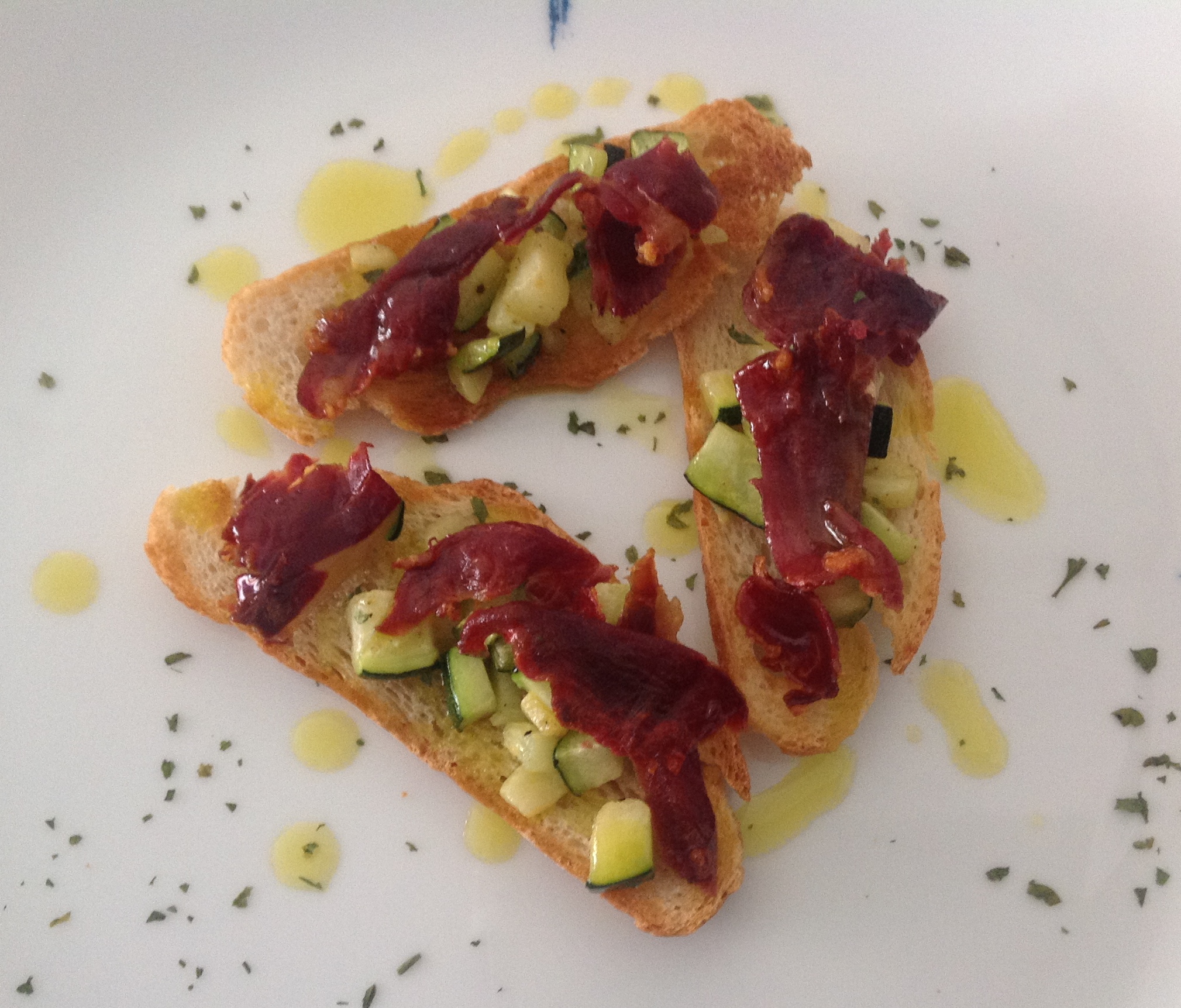 Pincho de calabacín con crujiente de jamón.
