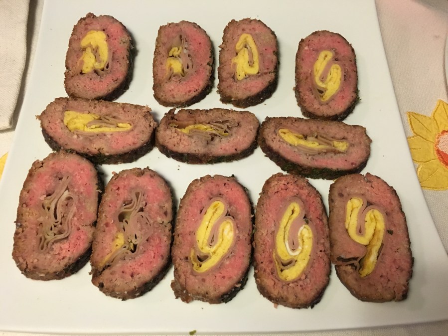 Fiambre de carne picada con caramelo, mortadela de Bolonia y tortilla.