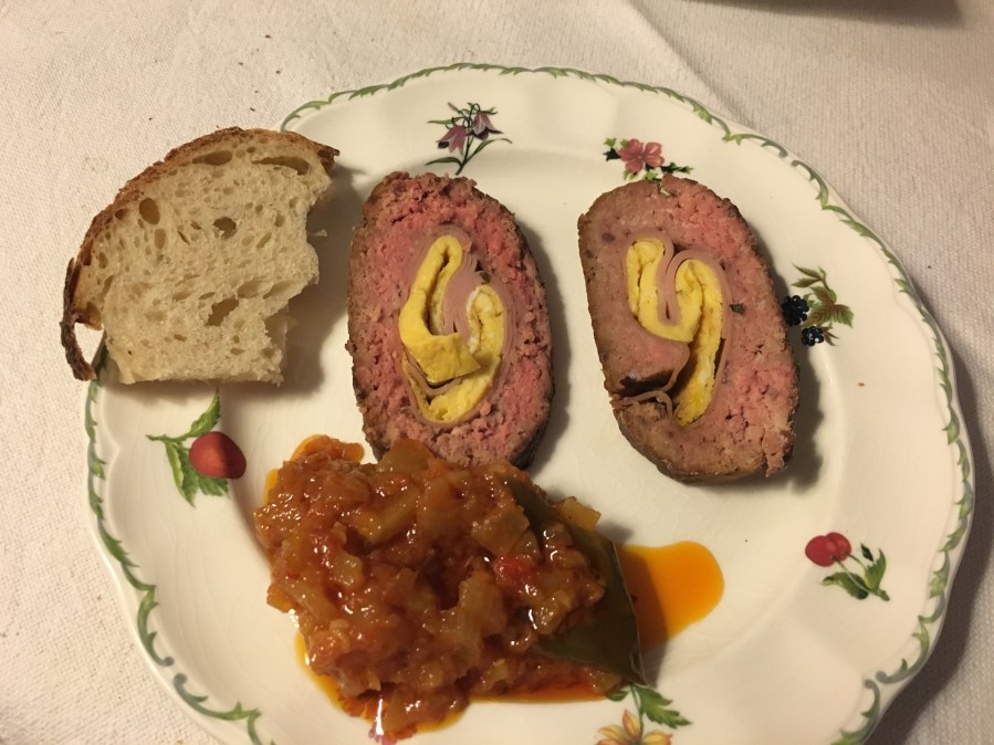 Fiambre de carne picada con caramelo, mortadela de Bolonia y tortilla.