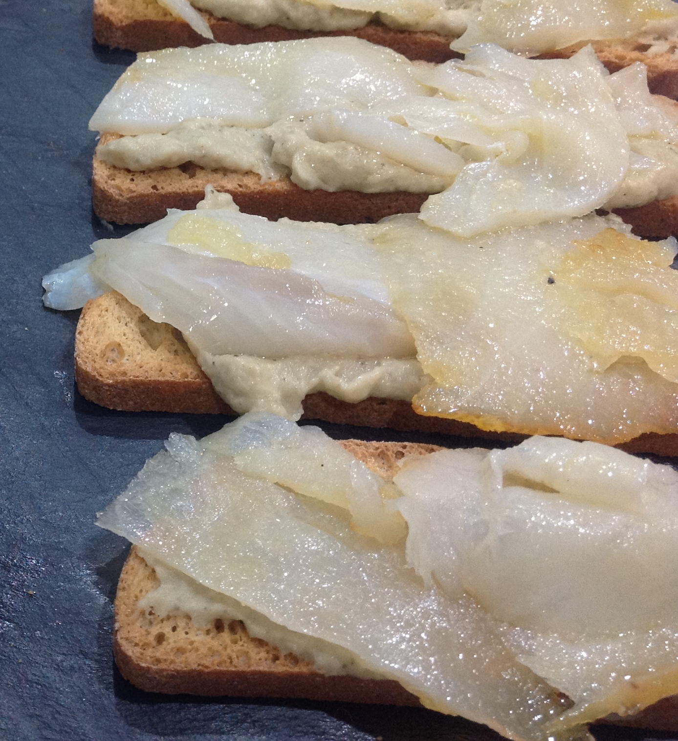 Tosta de paté de berenjena con bacalao ahumado.