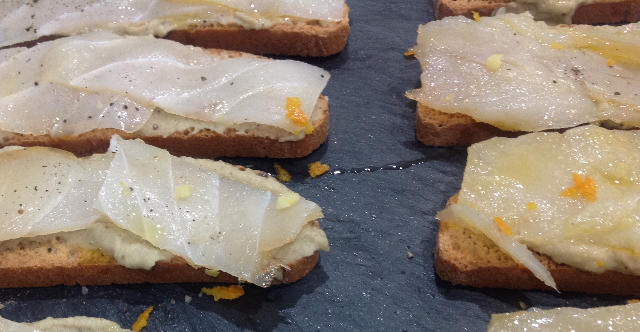 Tosta de paté de berenjena con bacalao ahumado.