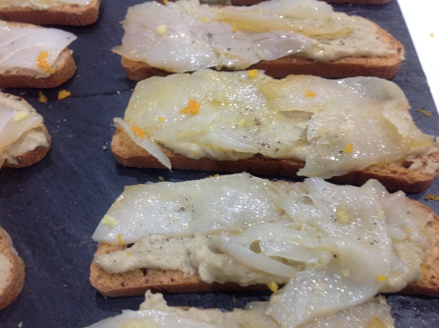 Tosta de paté de berenjena con bacalao ahumado.