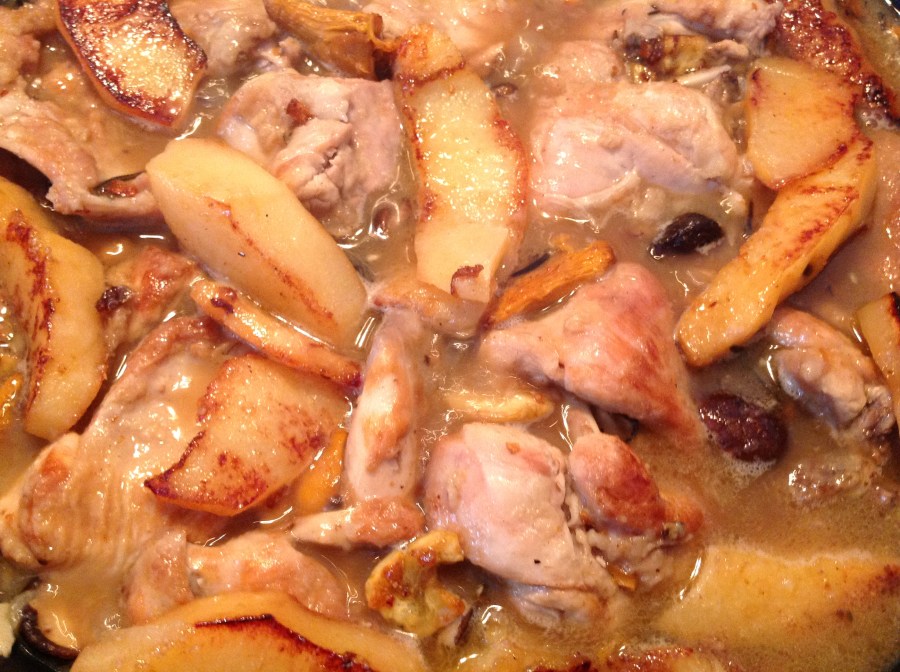Conejo con setas, castañas y membrillos.