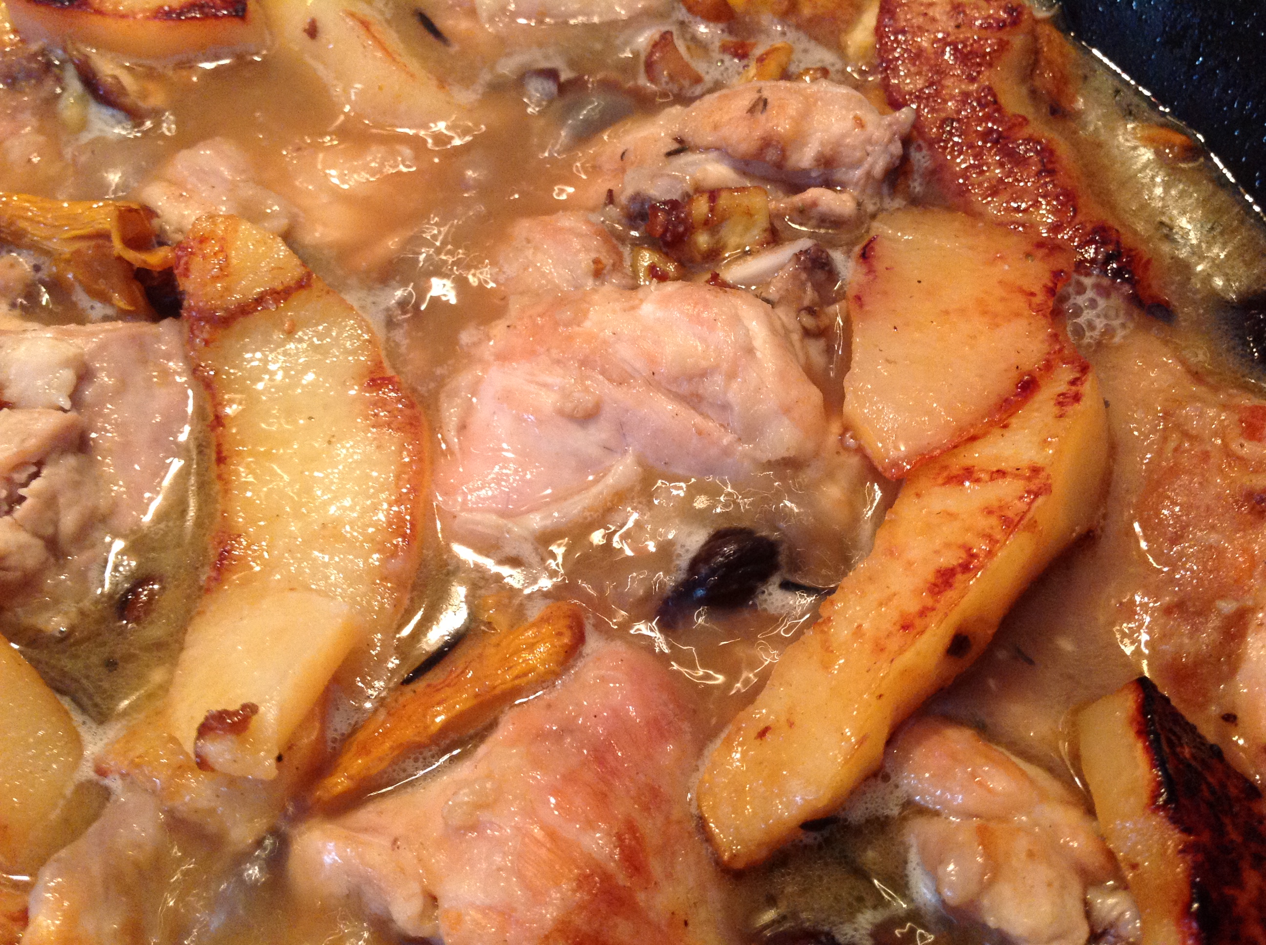 Conejo con setas, castañas y membrillos.