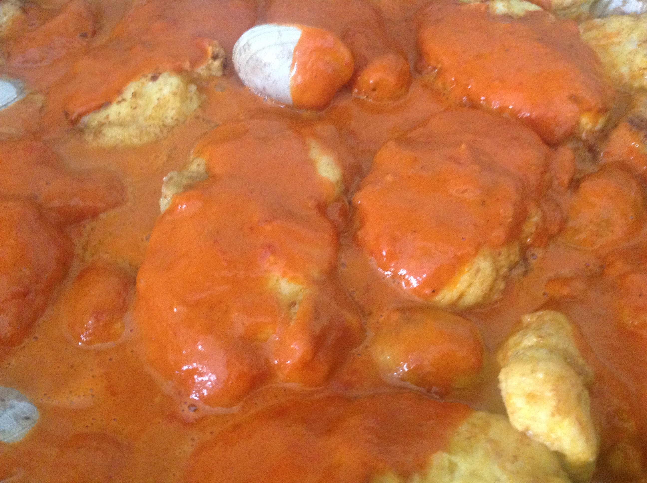 Rape al txakolí con salsa de pimientos de piquillo y tres almejas.